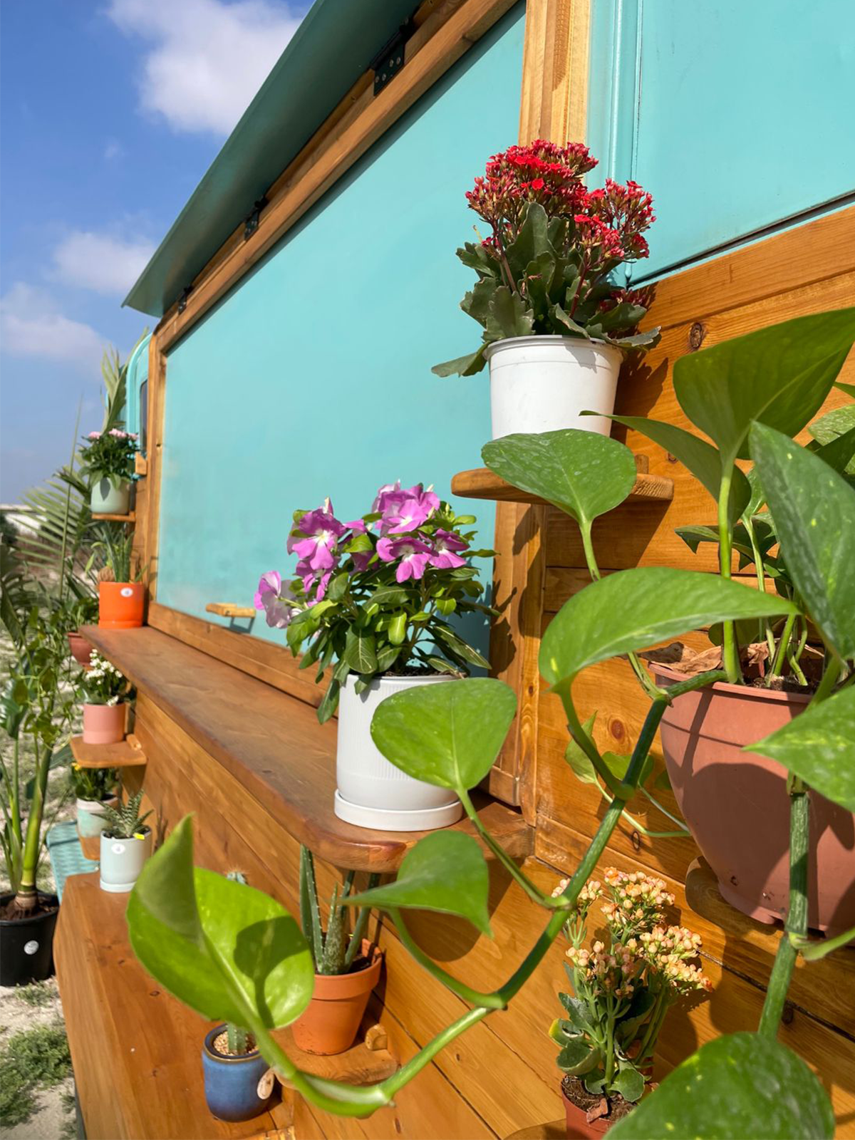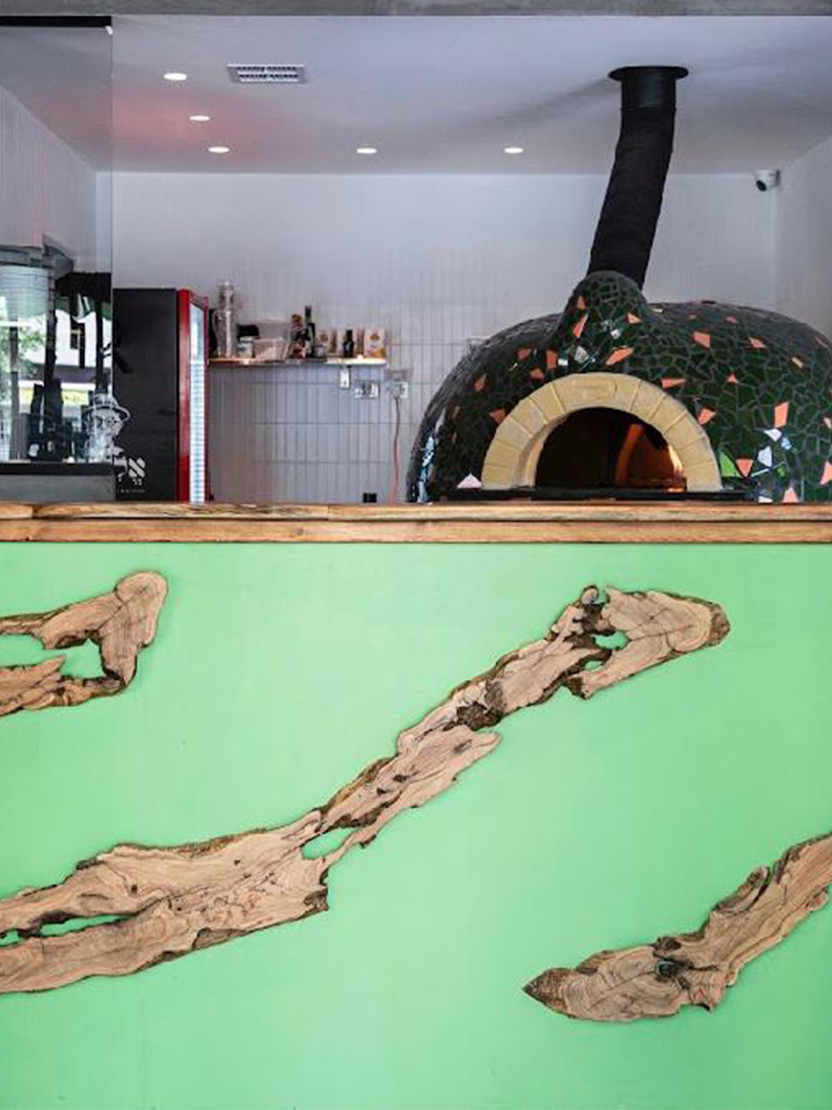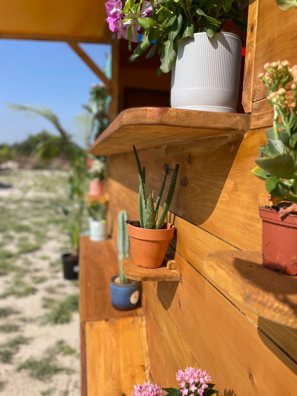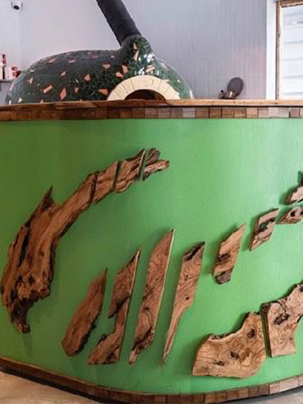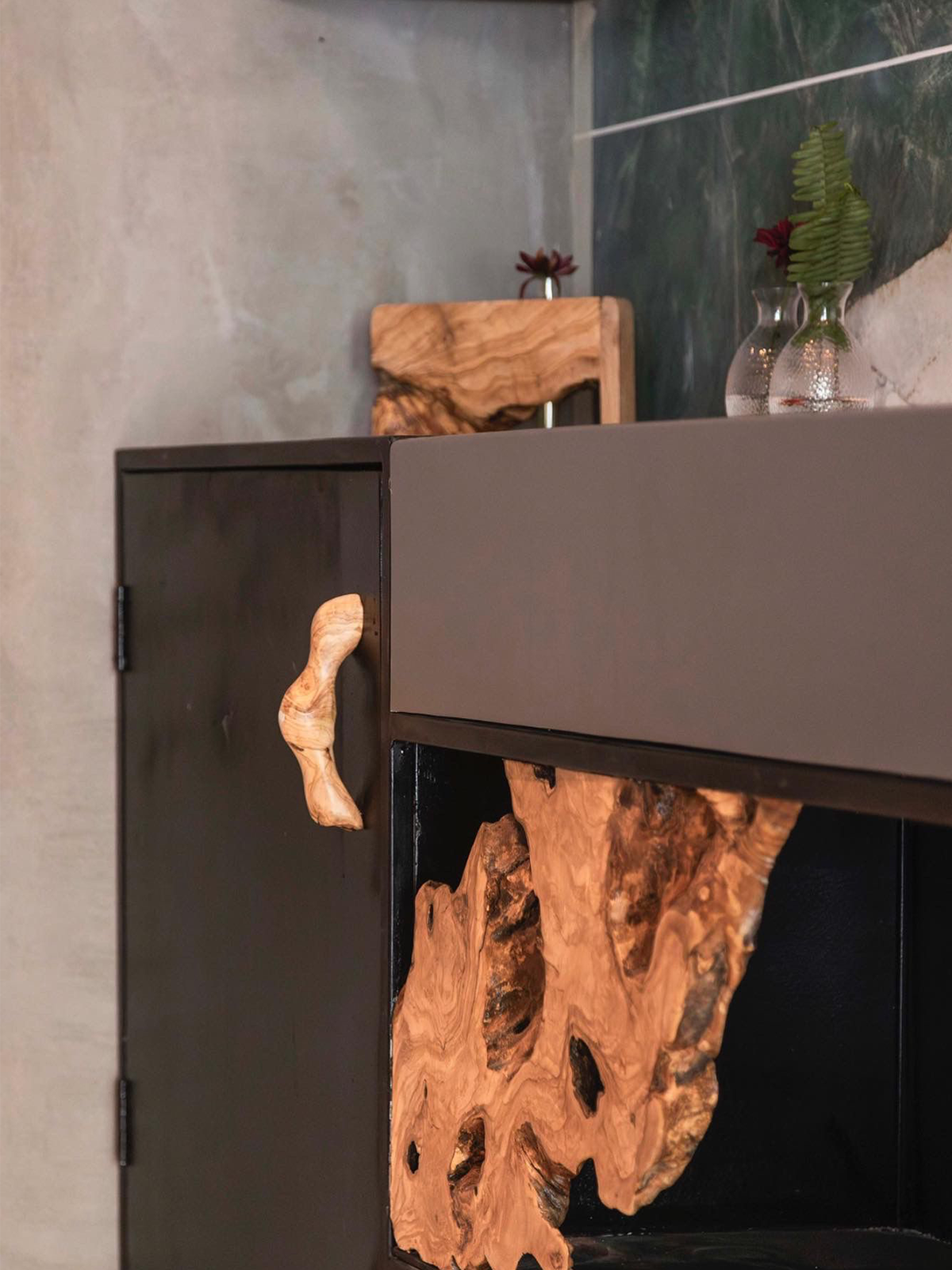 נבנה מעץ אורן ,צבוע בירוק נועז ומרענן עם טקסטורת פרוסות של עץ זית מיוחד עליו.