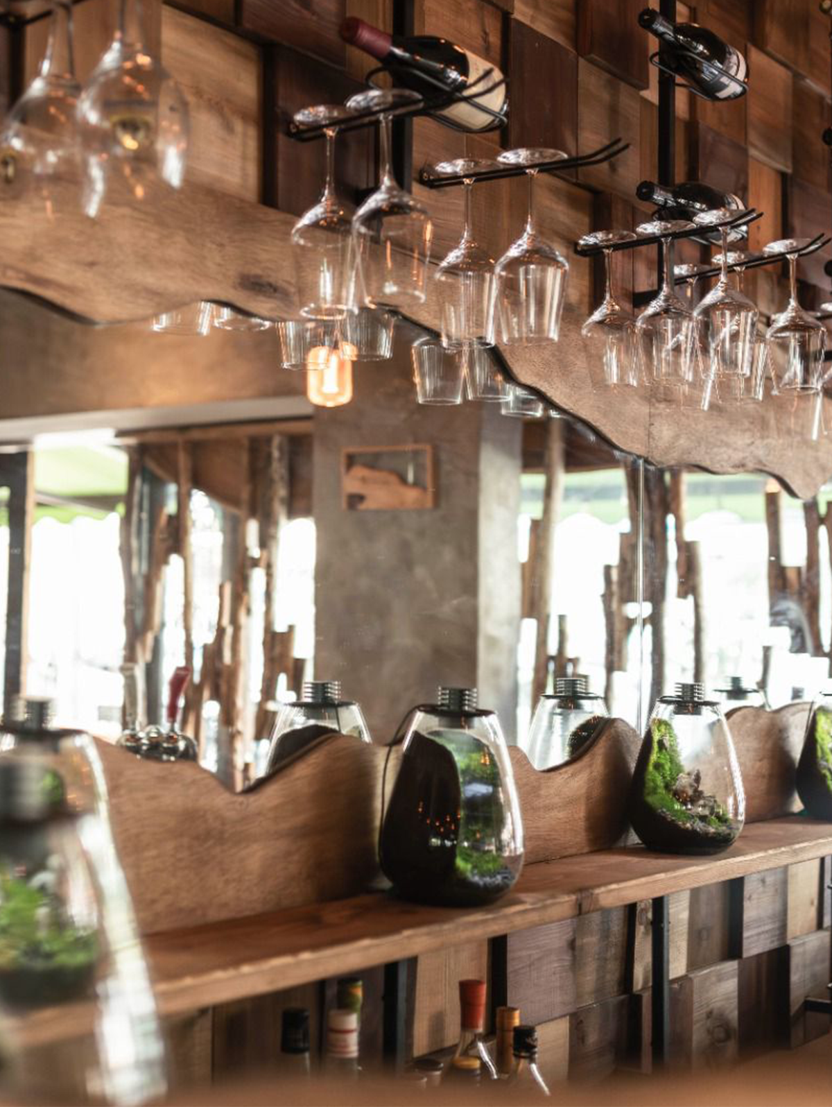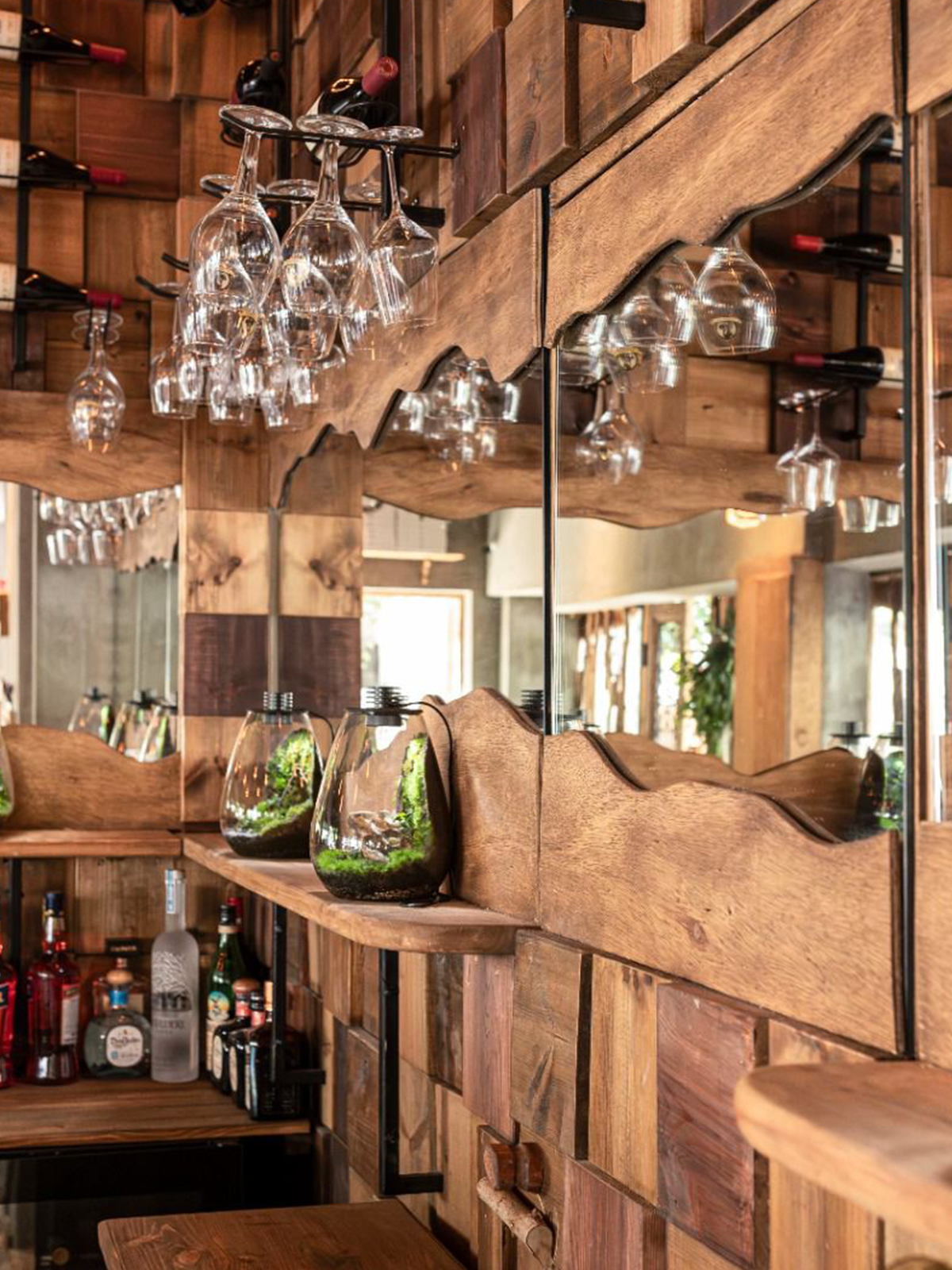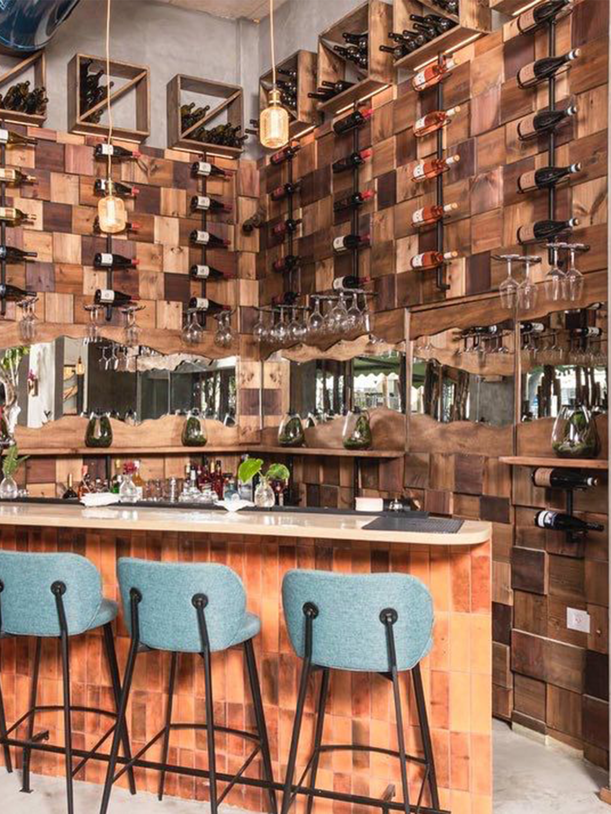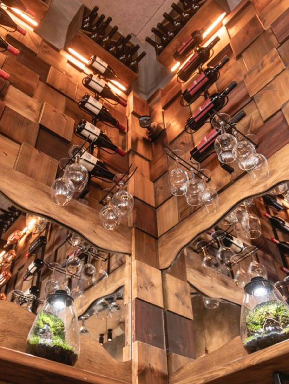 מידוף מעץ אורן, עבודת ריתוך וכיפוף ברזל עבור מעמדי יין ומחזיקי כוסות . תיבות אחסון עבור בקבוקי יין. מיקרוטופינג( בטון מוחלק) עבור בר היין .