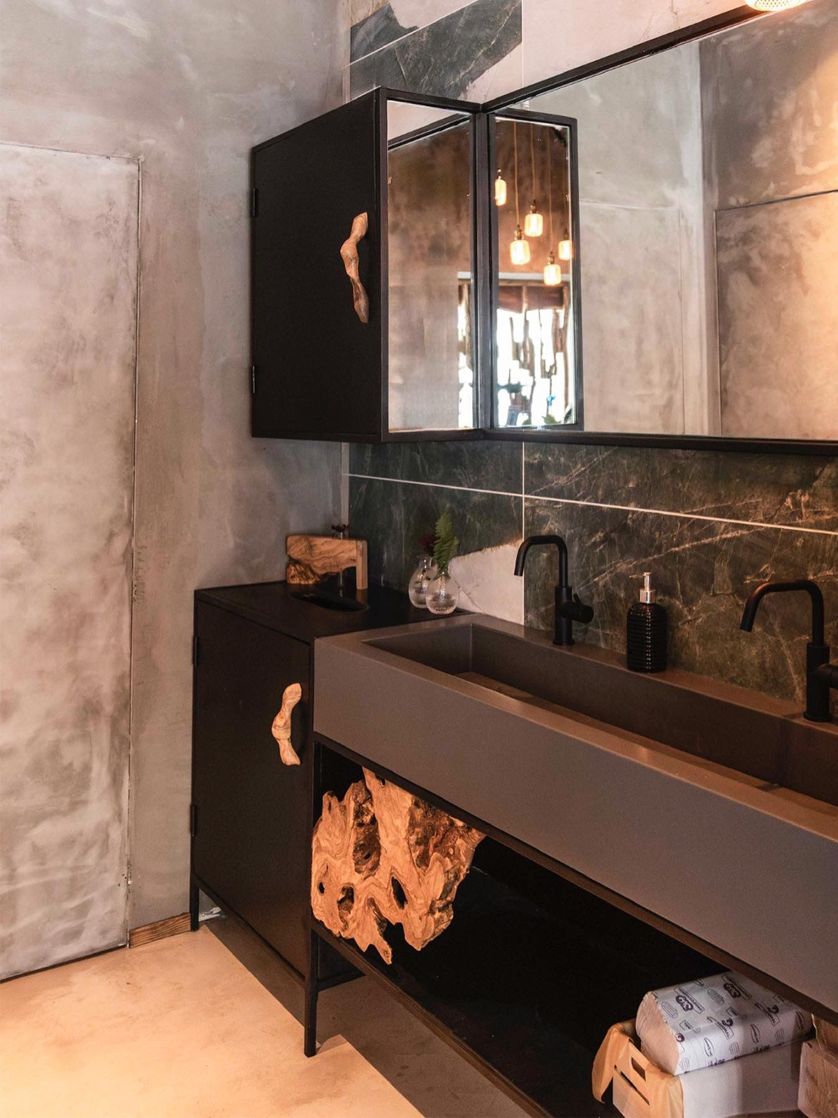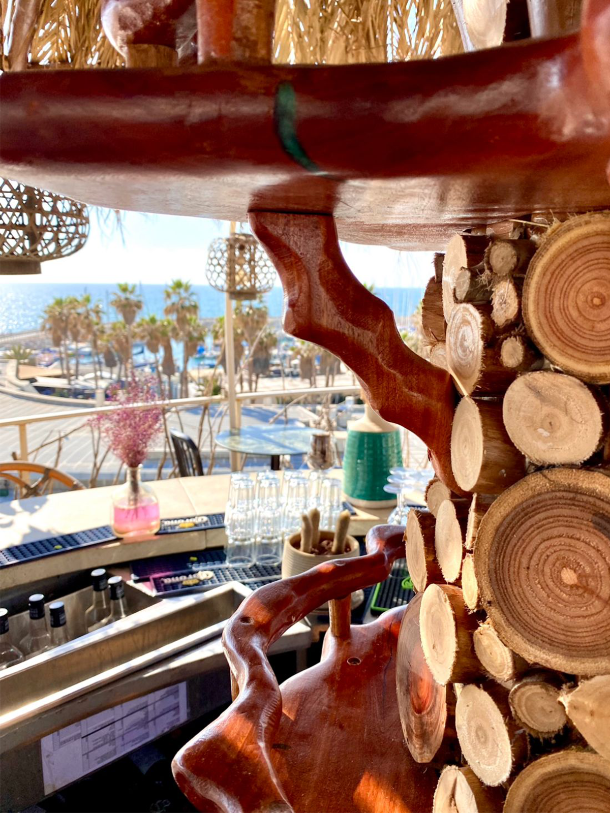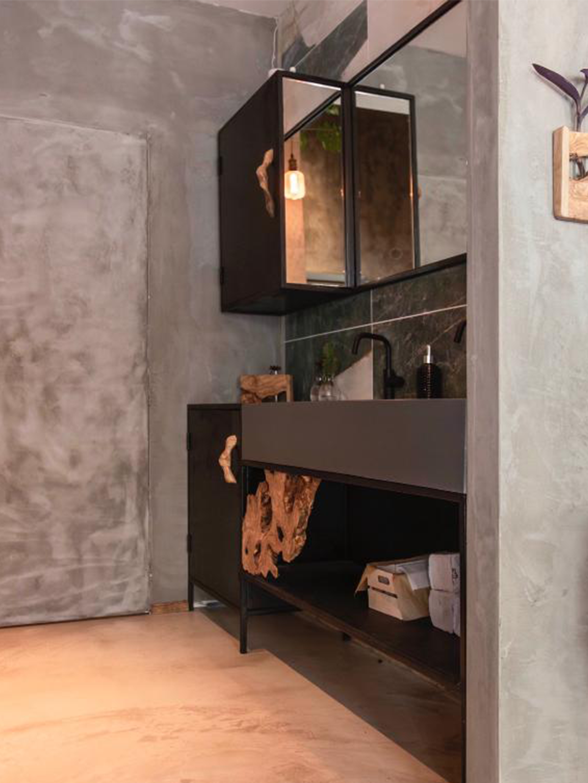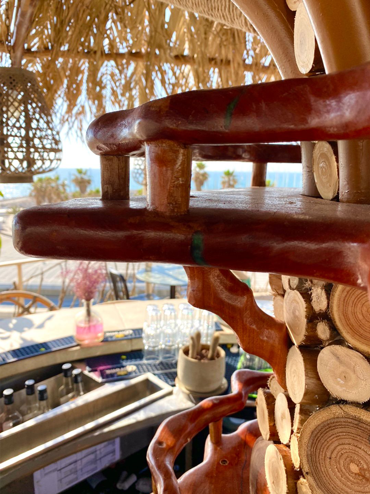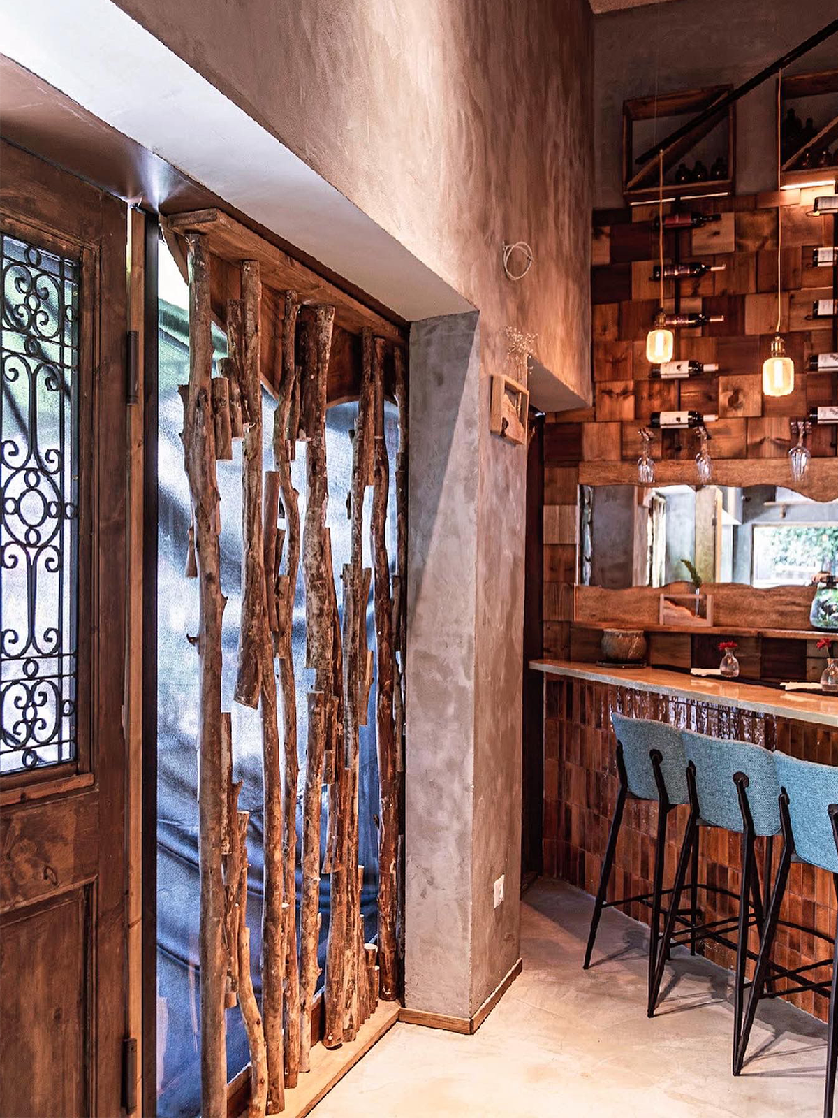 מידוף מעץ אורן, עבודת ריתוך וכיפוף ברזל עבור מעמדי יין ומחזיקי כוסות . תיבות אחסון עבור בקבוקי יין. מיקרוטופינג( בטון מוחלק) עבור בר היין .